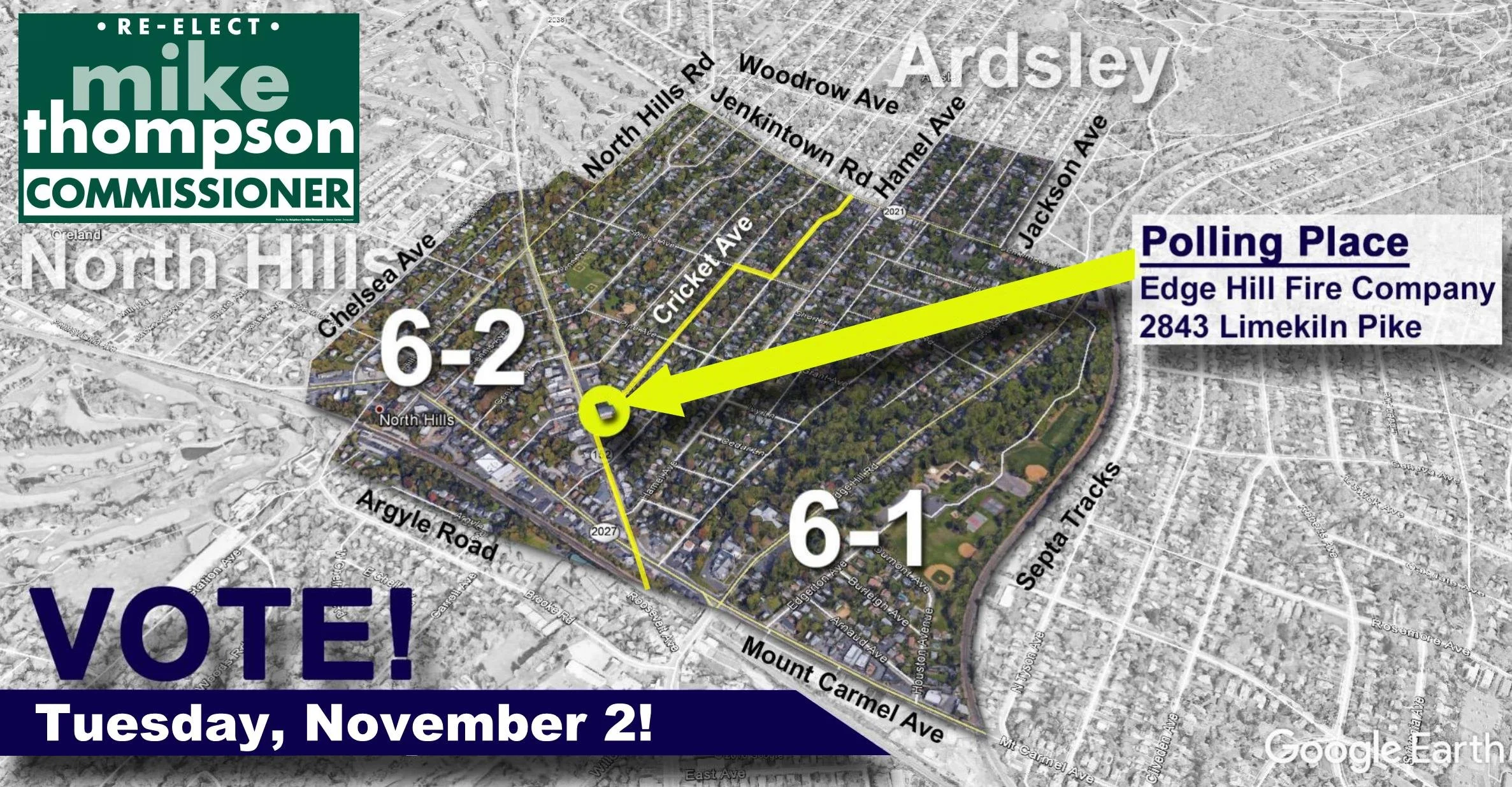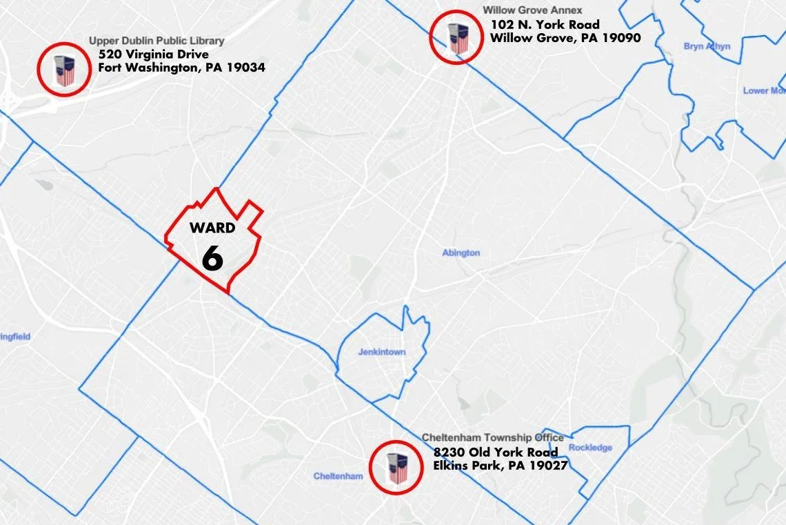 The Ward 6 polling place is at the Edge Hill Fire Company (2843 Limekiln Pike). Vote in person or vote by mail, just make sure you VOTE! If you’re voting by mail, you have until 8pm tomorrow evening to drop your ballot in one of the below ballot boxes.